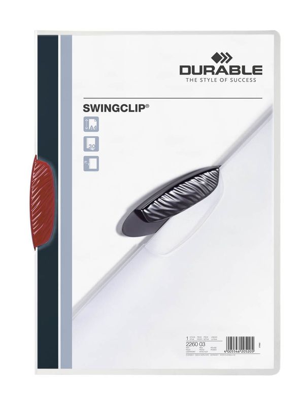 Klemm-Mappen Swingclip®, Farbe rot, Hersteller: Durable, Herstellernummer: 2260-03, EAN: 4005546205205, Präsentations-Klemm-Mappe mit seitlich schwenkbarer, farbiger Kunststoffklemme. Transparenter Vorder- und Rückdeckel aus Polypropylen (PP). Größe: 218 x 305 mm. Für bis zu 30 Blatt A4., Preis je Stück