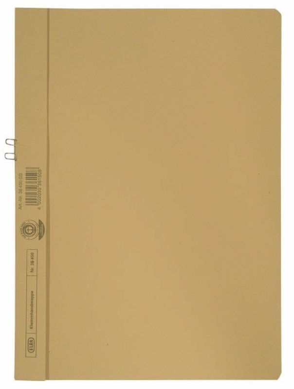 Klemmhandmappen, Farbe gelb, Hersteller: Elba, Herstellernummer: 36 450 GB, EAN: 4002030361508, Die Unterlagen werden in der Mappe durch einen Klemmschieber aus Metalldraht gehalten. Ohne Vorderdeckel. Aus 250 g/qm Manilakarton (RC). Für ca. 10 DIN A4-Blätter. Größe: 237 x 309 x 5 mm., Preis je Stück