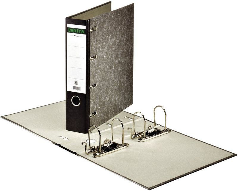 Doppelordner, Farbe schwarz, Hersteller: Centra, Herstellernummer: 220110, EAN: 3034152201104, Mit Qualitäts-Hebelmechaniken für 2 x A5 quer. Einband aus Pappe (RC) mit Wolkenmarmor-Papier (RC) bezogen. Aufgeklebtes Rückenschild. Griffloch, Schlitze und Kantenschutz. Rückenbreite 75 mm., Preis je Stück