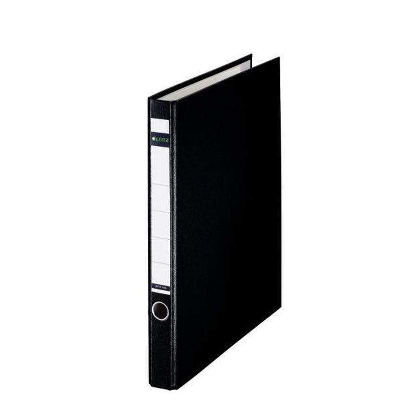 Ring-Farbordner, Rückenbreite 35 mm, Farbe schwarz, Hersteller: Leitz, Herstellernummer: 1014-00-95, EAN: 4002432376162, Einband aus Pappe (RC), außen mit Polypropylen kaschiert, innen hellgraues PE-beschichtetes Papier. Aufgeklebtes Rückenschild. 2-Ring-Reißmechanik mit Blattniederhalter. Kantenschutz und Griffloch. Für A4., Preis je Stück