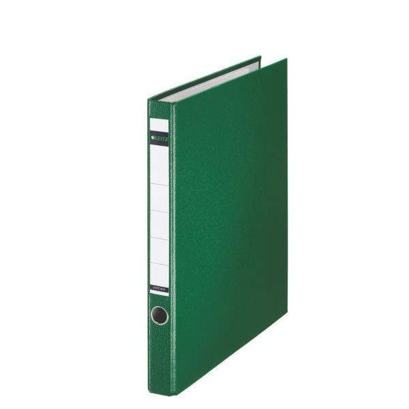 Ring-Farbordner, Rückenbreite 35mm, Farbe grün, Hersteller: Leitz, Herstellernummer: 1014-00-55, EAN: 4002432300761, Einband aus Pappe (RC), außen mit Polypropylen kaschiert, innen hellgraues PE-beschichtetes Papier. Aufgeklebtes Rückenschild. 2-Ring-Reißmechanik mit Blattniederhalter. Kantenschutz und Griffloch. Für A4., Preis je Stück