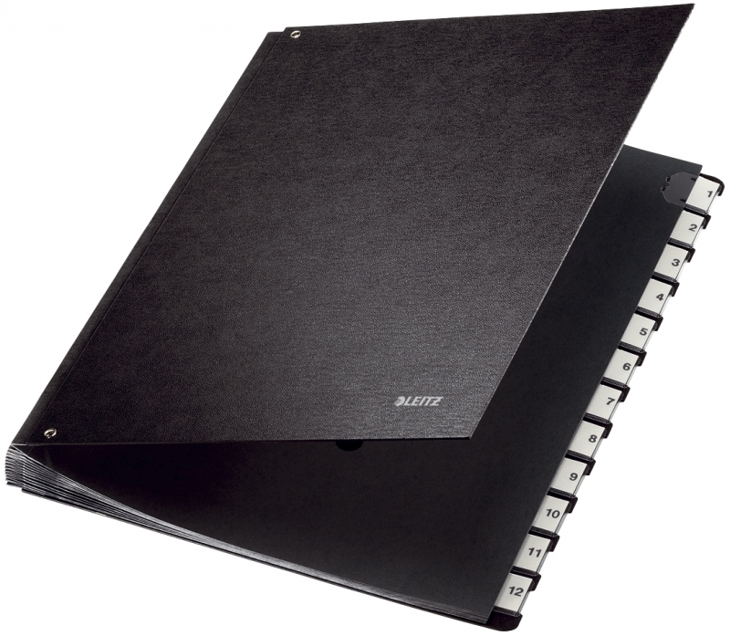 Pultordner Hartpappe, Ausführung 1 - 12, 12 Fächer, Hersteller: Leitz, Herstellernummer: 5812-00-95, EAN: 4002432311675, Einband aus Hartpappe (RC). Dehnbarer Rücken für hohes Füllvermögen. Zwischenblätter aus reißfestem Karton (RC) mit sechs Sichtlöchern. Überstehende Kunststoff-Tabe mit auswechselbaren Einsteckschildern. Größe: 270 x 345 mm. Farbe: schwarz., Preis je Stück