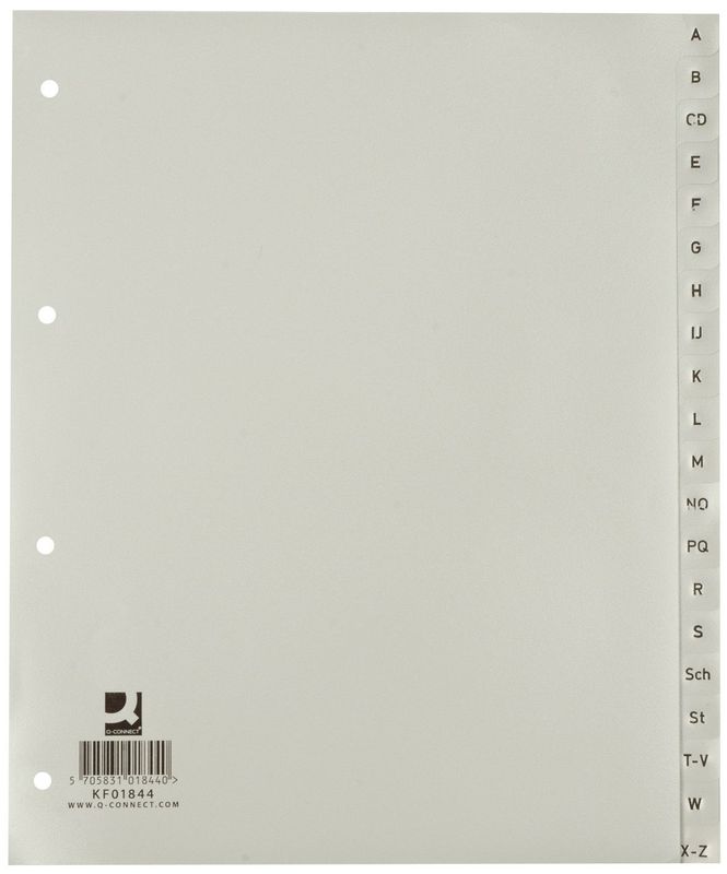 Register A - Z aus Kunststoff ohne Index, für Größe A4, überbreit, Register mit 20 Blatt, Hersteller: Connect, Herstellernummer: KF01844, EAN: 5705831018440, Aus Polypropylen (PP). Geprägte Tabe. Farbe: grau., Prei je Stück