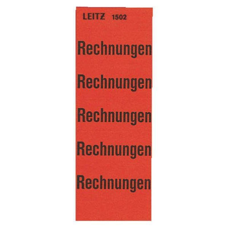 Inhaltsschilder Beutel mit 100 Stück, Aufdruck Rechnungen, Farbe rot, Hersteller: Leitz, Herstellernummer: 1502-00-00, EAN: 4002432302086, Zum Aufkleben auf den Ordnerrücken. Aus farbigem, selbstklebendem Papier, lösungsmittelfrei. Etikettengröße: 60 x 25,5 mm. Streifen mit 5 Schildchen., Preis je Packung