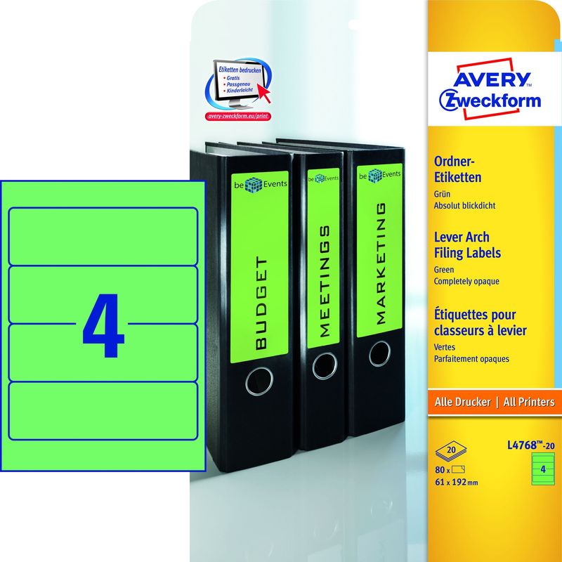 Ordnerrücken-Etiketten kurze, breite Schilder (61 x 192 mm), Inhalt/Blatt 80 Stück/20, Farbe grün, Hersteller: Avery Zweckform®, Herstellernummer: L4768-20, EAN: 4004182047682, Schnelleres Wiederfinden von Unterlagen durch klar und professionell beschriftete Ordner. Mit diesen absolut blickdichten und hochweißen oder farbigen Ordner-Etiketten lassen sich alte Beschriftungen zuverlässig abdecken und Ordner einfach wieder verwen, Preis je Packung