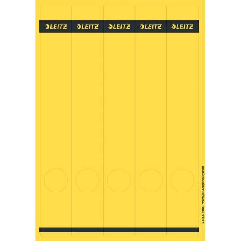 PC-beschriftbare Rückenschilder für Standard- und Hartpappeordner schmal, lang mit Loch 39 x 285 mm, Inhalt/Blatt 125 Stück/25, Farbe gelb, Hersteller: Leitz, Herstellernummer: 1688-00-15, EAN: 4002432330706, Selbstklebende Ordner-Rückenschilder auf A4-Blättern, lösungsmittelfrei. Für Laser-, Inkjetdrucker und Kopierer. Mit Easyprint können Sie die Rückenschilder einfach und bequem beschriften und ausdrucken: www.leitz.com/easyrint., Preis je Packung