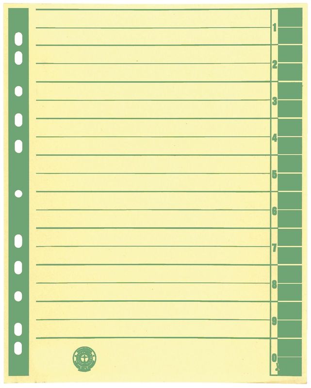 Farbiger Rahmendruck Farbiger Rahmendruck, Tabfarbe grün, Hersteller: neutral, Herstellernummer: 9541101100, EAN: 4018924941015, Die Register-Taben können an jeder Stelle angeschnitten werden. Taben mit farbigem Organisationsdruck. Linienaufdruck. Aus 230 g/qm Kraftkarton (RC). Eurolochung. Für A4. Grundfarbe: chamois. Packung mit 100 Stück., Preis je Packung