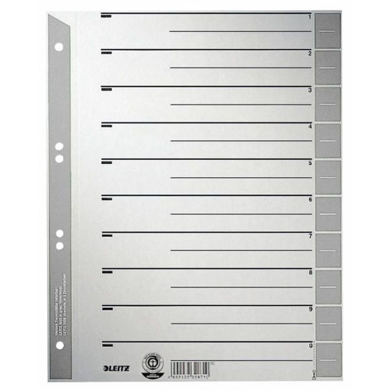 Trenn-, Deckblätter, Register, Tabfarbe grau, Hersteller: Leitz, Herstellernummer: 1652-00-85, EAN: 4002432328734, Die Register-Taben können an jeder Stelle angeschnitten werden. Mit Überbreite, bei Verwendung von Prospekthüllen bleiben die Taben sichtbar. Linienaufdruck. Lochung hinterklebt. Aus 230 g/qm Kraftkarton (RC). Für A4. Farbe: grau. Packung mit 100 Stück., Preis je Packung