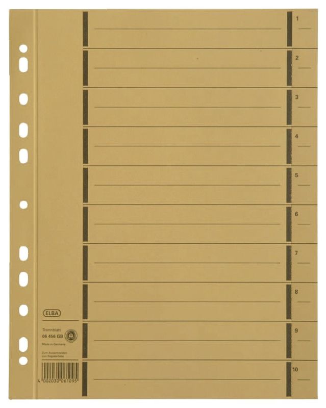 Trenn-, Deckblätter, Register, Farbe gelb, Hersteller: Elba, Herstellernummer: 06 456 GE, EAN: 4002030013421, Aus 250 g/qm Manilakarton (RC). Die Registertabe kann durch die Perforation abgetrennt werden. Mit Linienaufdruck 1-10, Eurolochung. Für A4. Packung mit 100 Stück., Preis je Packung