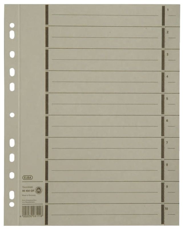 Trenn-, Deckblätter, Register, Farbe grau, Hersteller: Elba, Herstellernummer: 06 456 GR, EAN: 4002030013445, Aus 250 g/qm Manilakarton (RC). Die Registertabe kann durch die Perforation abgetrennt werden. Mit Linienaufdruck 1-10, Eurolochung. Für A4. Packung mit 100 Stück., Preis je Packung