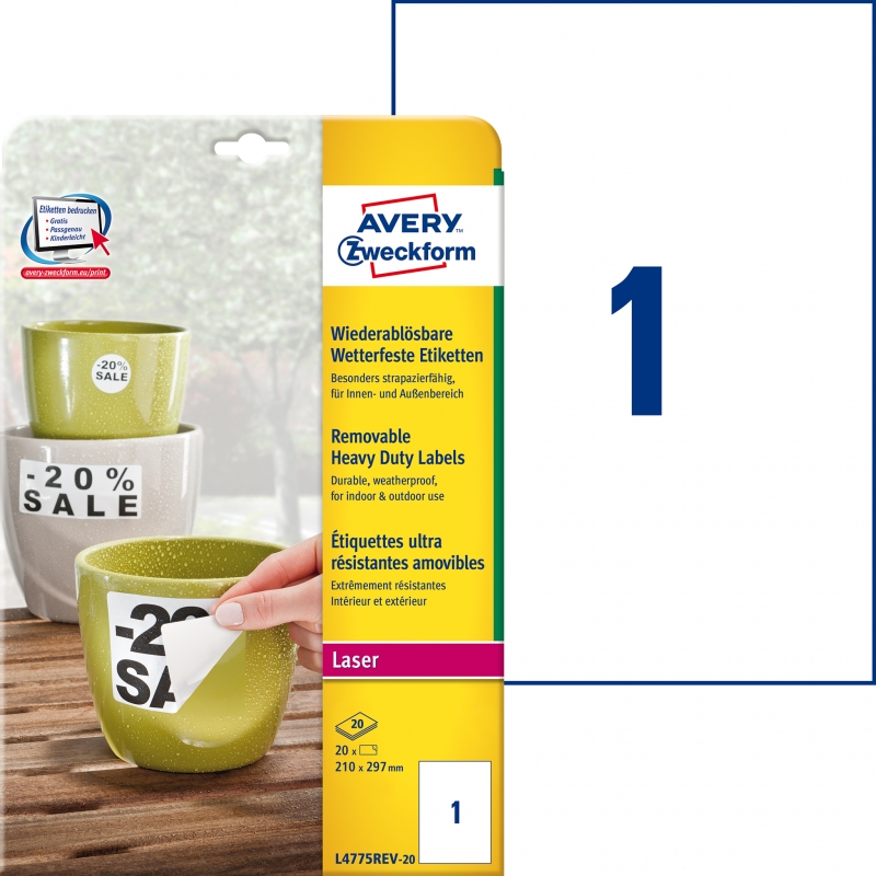 Die Etiketten wurden zur Inventar- & Eigentumskennzeichnung entwickelt. Sie bieten eine optimale Möglichkeit zur Sicherung und zum Schutz Ihres Eigentums. Ideal auch zur Lagerhaltung und Inventur geeignet. Die wetterfesten Etiketten sind wasserfest, UV- und temperaturbeständig (-20°C bis +80°C). Die wiederablösbaren, wetterfesten Folien-Etiketten sind ideal für strapazierfähige Beschriftungen, Markierungen und Schilder - immer dann, wenn ein rückstandsfreies Ablösen erwünscht ist. Bedrucken Sie Ihre Etiketten mit benutzerfreundlicher Software und Druckvorlagen - kostenloser Download unter www.avery-zweckform.eu. Für alle gängigen Laserdrucker und Kopierer geeignet. Kleine Helfer - große Wirkung! Von Avery Zweckform. Einfach perfekt.; Größe (B x H) 210x297mm; Farbe weiß; Inhalt/Blatt 20 Stück/20; EAN: 4004182067482; Herstellernummer: L4775REV-20