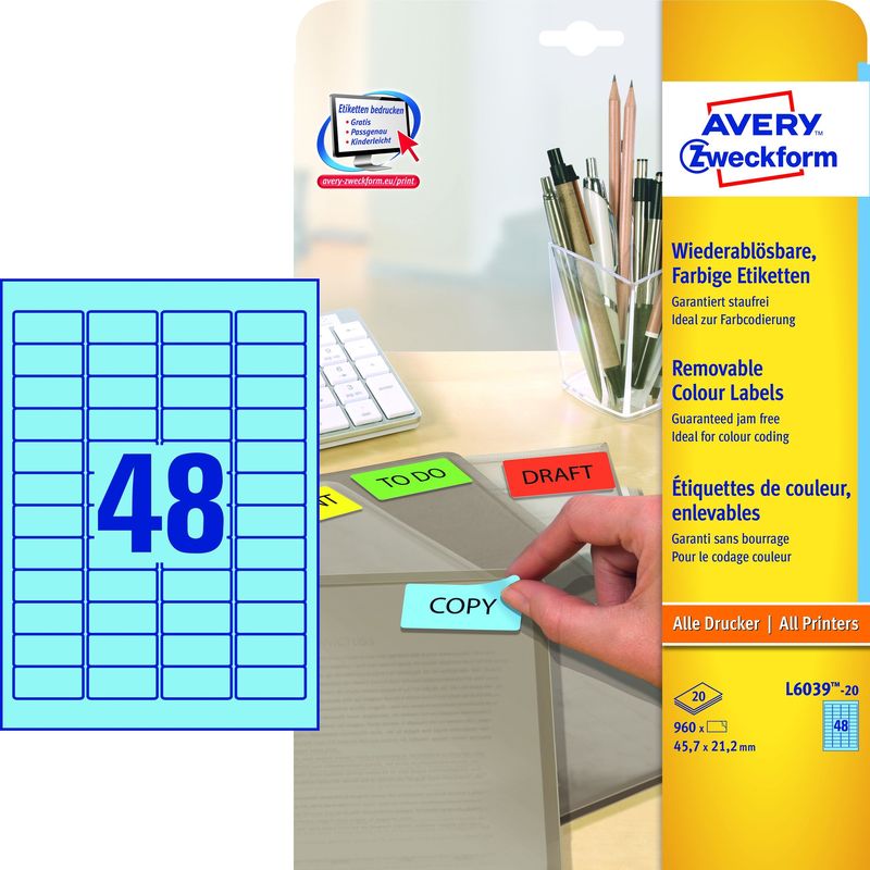 Wiederablösbare Kennzeichnungs-Etiketten Mini Stick+Lift Größe (BxH) 45,7x21,2 mm Inhalt/Blatt 960 Stück/20 Farbe blau, Wiederfinden leicht gemacht-. Kennzeichnen Sie Akten, Ordner, Behälter und vieles mehr mit den wiederablösbaren Avery Mini Etiketten. Damit Ihre Post nicht verloren geht-können Sie Avery Mini Etiketten auch als Absender-Etiketten verwenden, somit wird nicht zugestellte Post an Sie zurück geschickt. Geeignet für Inkjet-/Laser-/Farblaserdrucker und Kopierer., Preis je Packung, Hersteller: Avery Zweckform®, Herstellernummer: L6039-20, EAN: 4004182060391