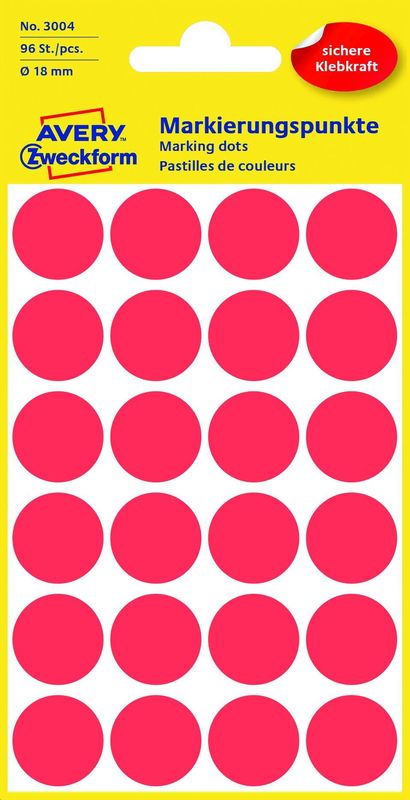 Markierungspunkte Größe: 18 mm Ø Inhalt 96 Stück Farbe rot, Aus holzfreiem, selbstklebendem Schreibpapier, chlorfrei gebleicht., Preis je Packung, Hersteller: Avery Zweckform®, Herstellernummer: 3004, EAN: 4004182030042