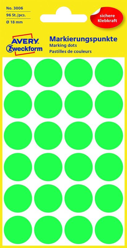 Markierungspunkte Größe: 18 mm Ø Inhalt 96 Stück Farbe grün, Aus holzfreiem, selbstklebendem Schreibpapier, chlorfrei gebleicht., Preis je Packung, Hersteller: Avery Zweckform®, Herstellernummer: 3006, EAN: 4004182030066