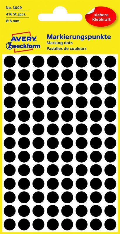 Markierungspunkte Größe: 8 mm Ø Inhalt 416 Stück Farbe schwarz, Aus holzfreiem, selbstklebendem Schreibpapier, chlorfrei gebleicht., Preis je Packung, Hersteller: Avery Zweckform®, Herstellernummer: 3009, EAN: 4004182030097