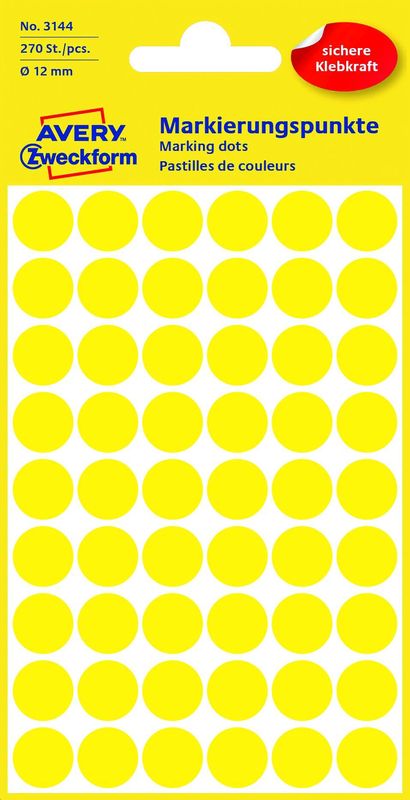 Markierungspunkte Größe: 12 mm Ø Inhalt 270 Stück Farbe gelb, Aus holzfreiem, selbstklebendem Schreibpapier, chlorfrei gebleicht., Preis je Packung, Hersteller: Avery Zweckform®, Herstellernummer: 3144, EAN: 4004182031445