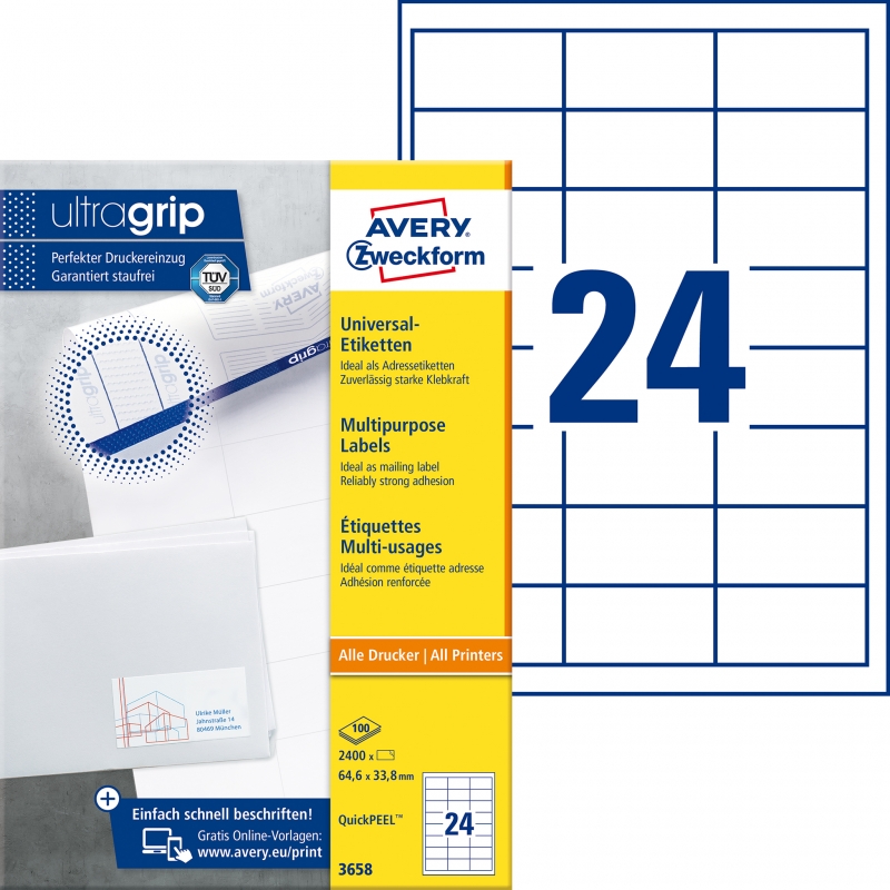 Universal-Etiketten QuickPEEL? Etiketten mit Rand rundum Größe (B x H) 64,6x33,8 mm Inhalt/Blatt 2400 Stück/100, Garantieren höchste Sicherheit während des gesamten Verarbeitungsprozesses. Mit der einzigartigen QuickPEEL Abziehhilfe lassen sich die Etiketten jetzt noch einfacher und schneller abziehen. Jetzt auf ausgewählten Etiketten-Formaten. Sicherer Druckerdurchlauf, klares Druckbild, sichere Haftung bei allen Standardanwendungen. Umweltfreundliche Etiketten, recycelbar mit dem Altpapier.Mit Papier aus vorbildlich bewirtschafteten Wäldern. Einfaches Gestalten und Drucken mit dem kostenlosen Avery Zweckform Assistenten für Microsoft Office. Hervorragende Laufeigenschaft auf Inkjet-, Laser-, Farblaserdruckern und Kopierern. Porto für Briefe und Pakete selbst drucken am PC - Die geeigneten Etikettenformate sind in der Produkttabelle gekennzeichnet: 1) für Deutsche Post INTERNETMARKE 2) für Deutsche Post STAMPIT 3) für DHL Online Frankierung. Auf A4-Blättern. Farbe: weiß. , Preis je Packung, Hersteller: Avery Zweckform®, Herstellernummer: 3658, EAN: 4004182036587