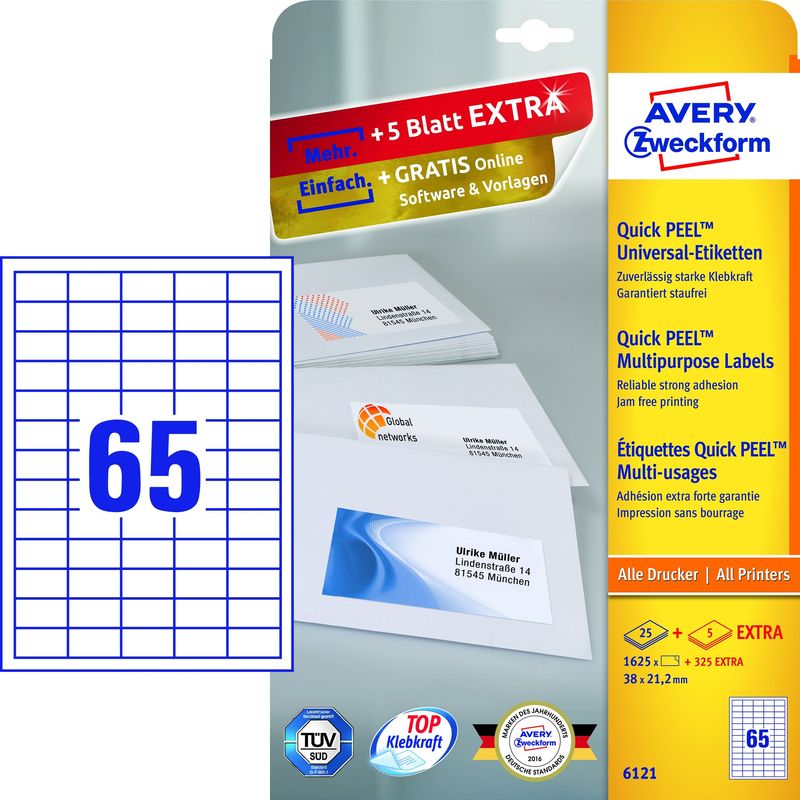 Universal-Etiketten QuickPEEL? Etiketten mit Rand rundum Größe (B x H) 38,0x21,2 mm Inhalt/Blatt 1625 Stück/25, Garantieren höchste Sicherheit während des gesamten Verarbeitungsprozesses. Mit der einzigartigen QuickPEEL Abziehhilfe lassen sich die Etiketten jetzt noch einfacher und schneller abziehen. Jetzt auf ausgewählten Etiketten-Formaten. Sicherer Druckerdurchlauf, klares Druckbild, sichere Haftung bei allen Standardanwendungen. Umweltfreundliche Etiketten, recycelbar mit dem Altpapier. Mit Papier aus vorbildlich bewirtschafteten Wäldern. Einfaches Gestalten und Drucken mit dem kostenlosen Avery Zweckform Assistenten für Microsoft Office. Hervorragende Laufeigenschaft auf Inkjet-, Laser-, Farblaserdruckern und Kopierern. Porto für Briefe und Pakete selbst drucken am PC - Die geeigneten Etikettenformate sind in der Produkttabelle gekennzeichnet: 1) für Deutsche Post INTERNETMARKE 2) für Deutsche Post STAMPIT 3) für DHL Online Frankierung. Auf A4-Blättern. Farbe: weiß. , Preis je Packung, Hersteller: Avery Zweckform®, Herstellernummer: 6121, EAN: 4004182061213