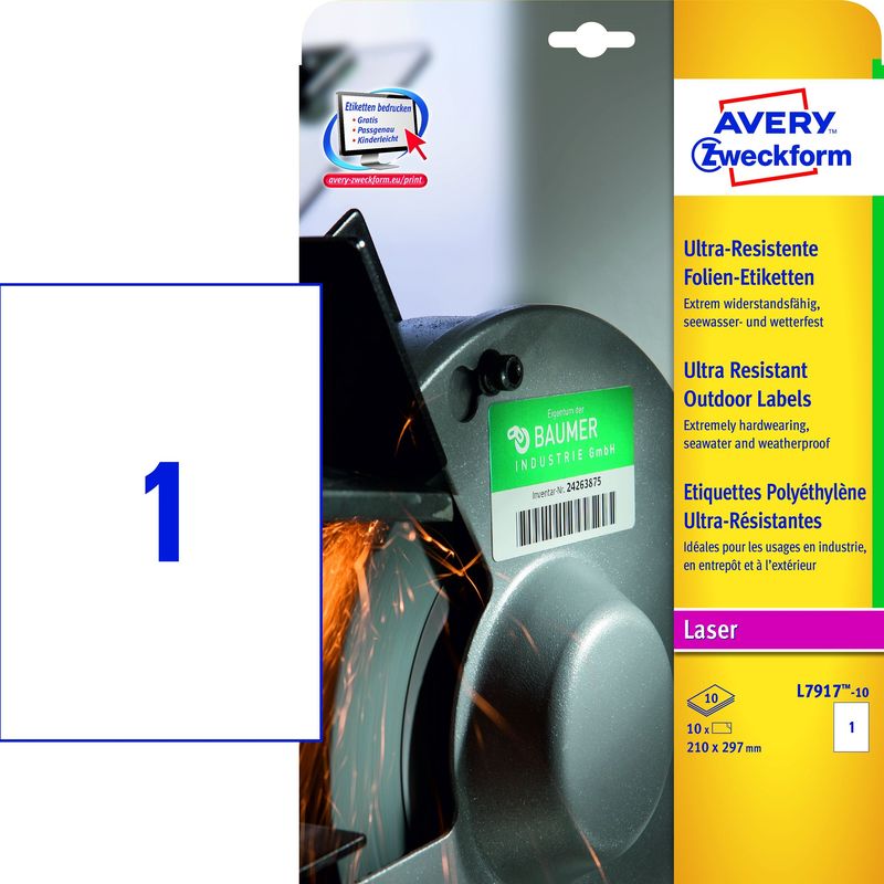 Die weißen, ultra-resistenten Folien-Etiketten im Format A4, zeichnen sich durch eine hohe Strapazierfähigkeit für höchste Beanspruchungen im Innen- und Außenraum aus. 10 matt beschichtete Folienetiketten aus dehnfähigem Polyethylen auf 10 Bogen. Durch die starke, permanente Haftung, auch auf schwierigen Oberflächen, eignen sie sich besonders zur Kennzeichnung in der Produktion und im Lager, zur Beschriftung von Containern oder zur Beschilderung. Die seewasserfesten Folienetiketten sind ultra-widerstandsfähig, wetterfest, öl-, schmutz-, UV- und temperaturbeständig (-40° bis +150°C). Zudem sind die abwaschbaren Etiketten resistent gegen viele Lösungs- und Reinigungsmittel. Gestalten und drucken Sie Ihre Aufkleber schnell und einfach - mit den kostenlosen Avery Zweckform Etiketten Vorlagen und Software-Lösungen unter www.avery-zweckform.eu/print oder den im Microsoft® Office Paket integrierten Basis-Vorlagen. Geeignet für alle gängigen Laserdrucker.; Größe (B x H): 210x297 mm; Farbe: weiß; Inhalt/Blatt: 10 Stück/10; Hersteller: Avery Zweckform; Herstellernummer: L7917-10; Preis pro Packung; EAN: 4004182068021