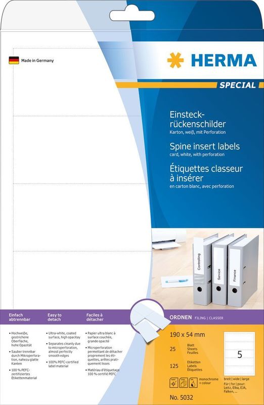 Einsteck-Rückenschilder, nicht klebend Größe (B x H) 54 x 190 mm Inhalt/Blatt 125 Stück/25 Farbe weiß, A4, für breite und schmale Ordner mit Sichtfenster. Für alle PC-Drucker und Kopierer, schwarz und Farbe. Hochweißer, satinierter Spezialkarton mit hoher Deckkraft. Sauber trennbar durch Mikroperforation. Blanko: Ideal für Firmenlogo, Beschriftungen und Ordnungsvermerke. Kostenlose Softwarelösungen: www.herma.de/software, Preis je Packung, Hersteller: Herma, Herstellernummer: 5032, EAN: 4008705050326