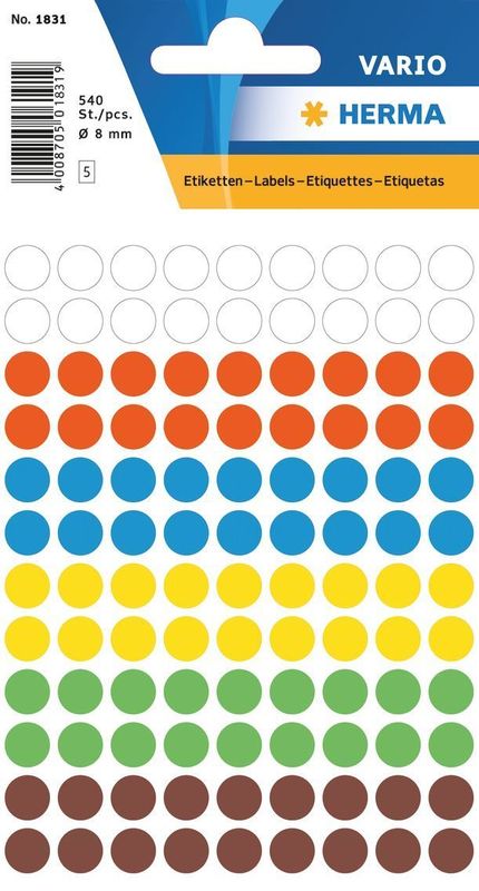 Farb-/Markierungs-Punkte Größe: 8 mm ø Inhalt 540 Stück Farbe sortiert, Vielzwecketiketten zum Markieren und Organisieren. Selbstklebende Etiketten aus hochwertigem Schreibpapier. Etiketten und Trägerpapier aus chlorfrei gebleichtem Zellstoff, Kleber lösemittelfrei. Zum Beschriften mit allen Schreibgeräten und Schreibmaschinen., Preis je Packung, Hersteller: Herma, Herstellernummer: 1831, EAN: 4008705018319