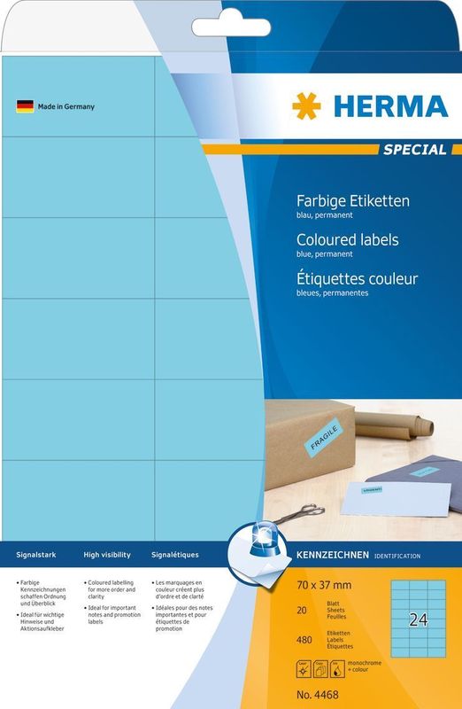 SuperPrint Etiketten Größe (BxH) 70x37 mm Inhalt/Blatt 480 Stück/20 Farbe blau, Selbstklebende Etiketten auf A4-Blättern. Perfekt für alle PC-Drucker (Laser/Inkjet/Matrix), Kopierer, Multifunktionsgeräte, auch für Farblaserdrucker / Farbkopierer geeignet. Hochwertiges Spezialpapier, chlorfrei gebleicht, lösemittelfreier Haftkleber. Das Etikettenpapier in High-Resolution-Quality garantiert perfekte Tonerfixierung und optimale Druckergebnisse im Laserdruck, auch bei hohen Auflösungen. Störungsfreie Verarbeitung durch Rundum-Sicherheitskante und optimale Planlage., Preis je Packung, Hersteller: Herma, Herstellernummer: 4468, EAN: 4008705044684