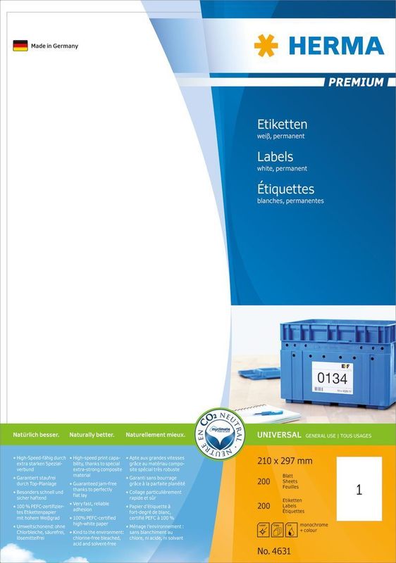 SuperPrint Etiketten ohne Rand Größe (B x H) 210,0x297,0 mm Inhalt/Blatt 200 Stück/200, Premium-Etiketten auf A4-Blättern, mit höchster Verarbeitungssicherheit. Perfekt für alle Laser- undInkjetdrucker, Kopierer, Multifunktionsgeräte, Farblaserdrucker und Farbkopierer. Sehr gute Druckergebnisse,hoher Weißgrad, sichere Haftung. Umweltfreundlich: hochwertiges, chlorfrei gebleichtesSpezialpapier, PEFC-zertifiziert, lösemittelfreier Haftkleber. Etiketten 100% recyclingfähig mit demAltpapier, Verpackung aus Recyclingkarton. Kostenlose Softwarelösungen: www.herma.de/software -zum Downloaden oder direkt im Internet gestalten. Farbe: weiß., Preis je Packung, Hersteller: Herma, Herstellernummer: 4631, EAN: 4008705046312