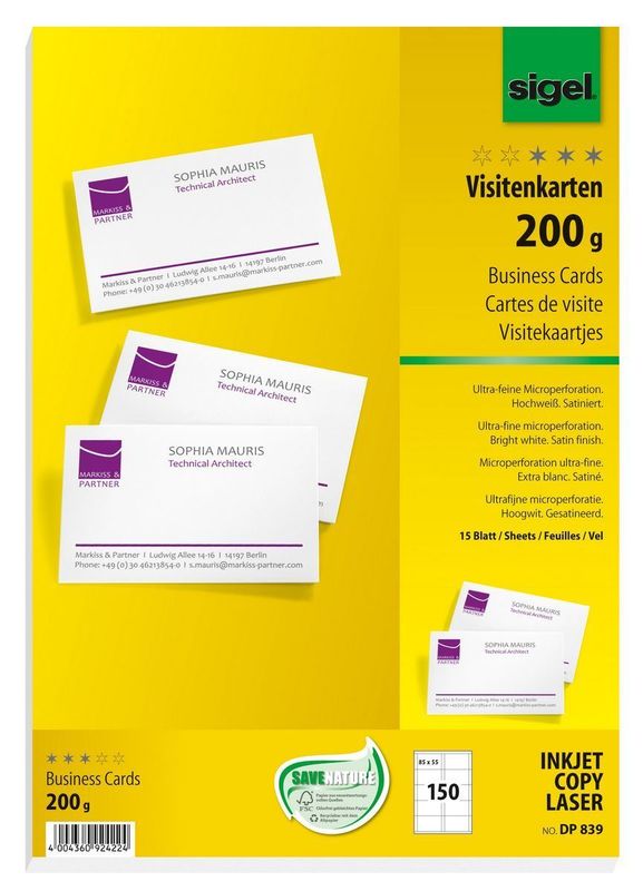 PC-Visitenkarten, weiß mit Microperforation Gewicht 200 g/qm Inhalt/Blatt 150 Stück/15, Hochweiße Visitenkarten, 85 x 55 mm, auf A4-Edelkarton. Mit ultrafeiner Microperforation (MP). Für Kopierer, Laser-, Inkjetdrucker oder Schreibmaschine., Preis je Packung, Hersteller: Sigel®, Herstellernummer: DP839, EAN: 4004360924224