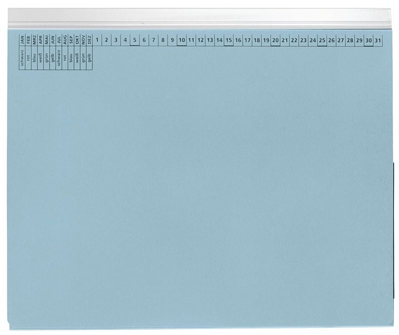 Hängehefter mit Organisationsleiste, Tasche und Abheftvorrichung, mit Organisationsdruck auf der Vorderseite zur Kennzeichnung von Wiedervorlageterminen, etc. aus umweltfreundlichem Manila-Karton 320 g/qm, gebrauchsfertig gefalzt, mit Spezialklammern und Metalldeckleiste ausgestattet. Zubehör wie Hängeschiene und Organisationsstreifen bitte separat bestellen. Preis pro Stück