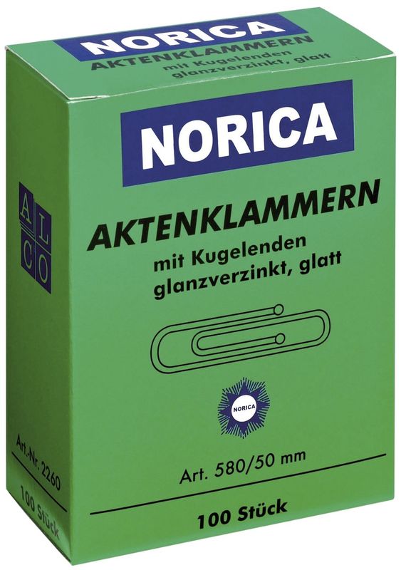 Aktenklammern mit Kugelenden, Länge/Form 50 mm/glatt, Schachtel mit 100 Stück, Hersteller: Norica, Herstellernummer: 1631, EAN: 4022696163100, Glanzverzinkt., Preis je Packung