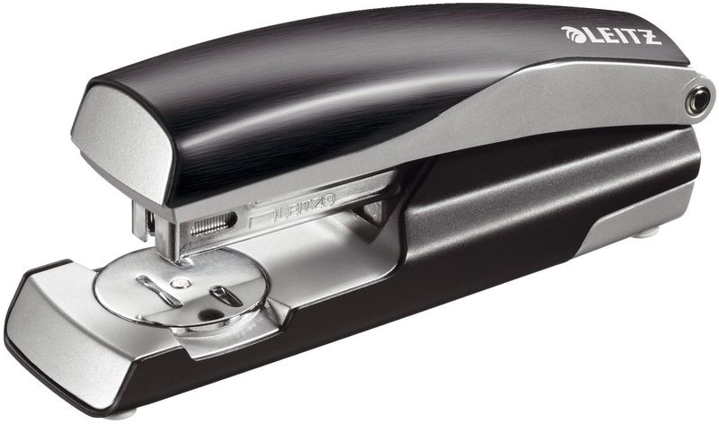 Leitz Büroheftgerät NeXXt Style, mit Oberlademechanik, für offene und geschlossene Heftung, Tackerfunktion, mit Drehamboss und integriertem Entklammerer, mit gebürsteter Metall-Oberfläche und Silber als Kontrastfarbe, mit Direct Impact Technology (DIT) für perfektes und problemloses Heften, inklusive 200 Heftklammern 24/6. Heftleistung: 3 mm/30 Blatt. Heftklammern: 100 x 24/6 oder 140 x 26/6. Einlegetiefe: 65 mm. Material: Metall mit Kunststoff. Farbe: satin schwarz.