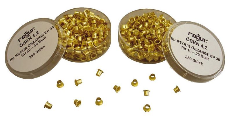 Ösenzange EP 30, Ausführung 250 Ösen 3,2 mm für 2-10 Blatt, Hersteller: Regur®, Herstellernummer: RÖ-3,2, EAN: 4001973015295, Stabile, verchromte Metallzange für die dauerhafte Verbindung von Dokumenten. Maximale Stanzkapazität 30 Blatt. Regulierbare Einschubtiefe von 4 - 12 mm. Auch geeignet für Folien, Textilien, Leder und Pappe, zur Fertigung von Anhängern und Bastelarbeiten. Für Ösen 3,2, 4,2 und 5,2 mm., Preis je Packung