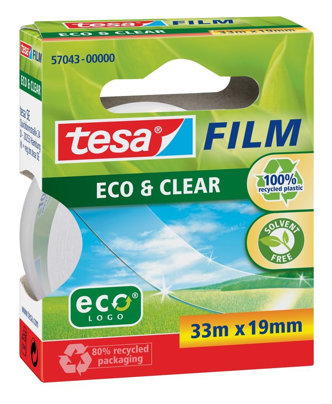 Film Eco & Clear, Große (B x L) 19 mm x 33 m, Hersteller: Tesa®, Herstellernummer: 57043-00000, EAN: 4042448164926, Der verlässliche tesafilm® nun auch als recycelte, umweltfreundliche Variante erhältlich: 100% Qualität + 100% recycelter Kunststoff! Lösungsmittelfreie Klebmasse, Verpackung aus 80% recyceltem Karton, Rollkern aus 100% recyceltem Kunststoff (PS), Trägerfolie aus 100% recyceltem Kunststoff (PP). Starke Klebkraft, hohe Alterungsbeständigkeit. Mit nahezu allen Schreibgeräten beschriftbar - sogar mit Füller! , Preis je Stück