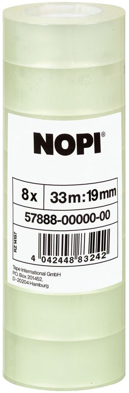 Klebefilme, Größe (B x L) 19 mm x 33 m, Packung mit 8 Stück, Hersteller: Nopi, Herstellernummer: 57888, EAN: 4042448833242, PP-Folie transparent, Acrylatkleber, klebt auf Papier. Geeignet für alle tesafilm Abroller. , Preis je Packung
