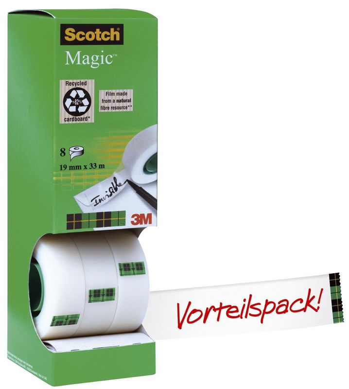 Scotch® Magic Tape 810 - unsichtbar Packung mit 8 Rollen, Größe (B x L) 19 mm x 33 m, Hersteller: Scotch®, Herstellernummer: 8-1933R8, EAN: 4046719205936, Das optimale Büroklebeband. Transparenter Klebefilm mit matter Oberfläche und starker Klebekraft. Aufgeklebt unsichtbar, schattenfrei kopierbar, beschriftbar, lichtpausfähig, alterungsbeständig, hitzebeständig bis 150°C. Aus Zellulose-Acetat, einem Naturprodukt auf Zellstoffbasis., Preis je Packung