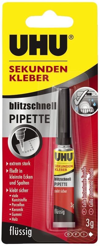 Sekundenkleber blitzschnell, Inhalt 3 g, Hersteller: UHU®, Herstellernummer: 45570, EAN: 4026700455700, Flüssiger Sekundenkleber in der Pipette zum punktgenauen Dosieren. Für Gummi, Metall, Porzellan, Hart-Kunststoffe, Resopal®, Bakelit® und Duroplast., Preis je Stück
