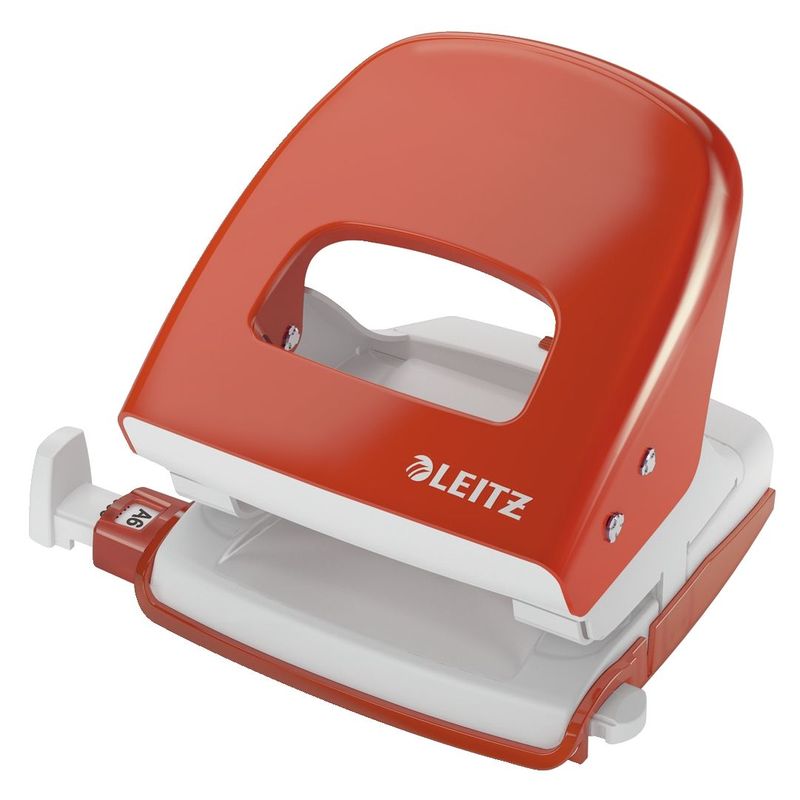 Leitz Bürolocher NeXXt Metall, mit Anschlagschiene aus Kunststoff, Anschlagschiene mit farbiger Bedruckung und Fenster. Mit transprarentem, rutschfestem Kunststoffboden (Abfallkasten), mit patentierter Griffmulde und ultra-scharfen Lochstempeln, auch für 4-fach Lochung geeignet. Stanzleistung/Blatt: 3 mm/30. Material: Metall. Farbe: violett.