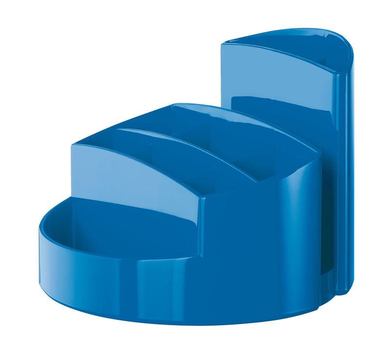 Schreibtischköcher RONDO. Die trendigen, hochglänzenden New Colours machen gute Laune und sind universell einsetzbar auf jedem Schreibtisch. Klare Linienführung vereint mit hochwertiger Verarbeitung in Hochglanz und funktionellem Design: durchdacht, dynamisch und elegant. 9 Fächer inkl. praktischem Brief- und Kartenschlitz. In diesem Stifteköcher finden Ihre Stifte und Büroutensilien schnell einen Platz und sind immer griffbereit. Standfest und stabil. Rutschfest durch möbelschonende Gummifüße. Made in Germany. Außenmaße (B x T x H): 140 x 140 x 109 mm. Material: hochwertiger Kunststoff, Polystyrol (PS). Farbe: New Colours blau.