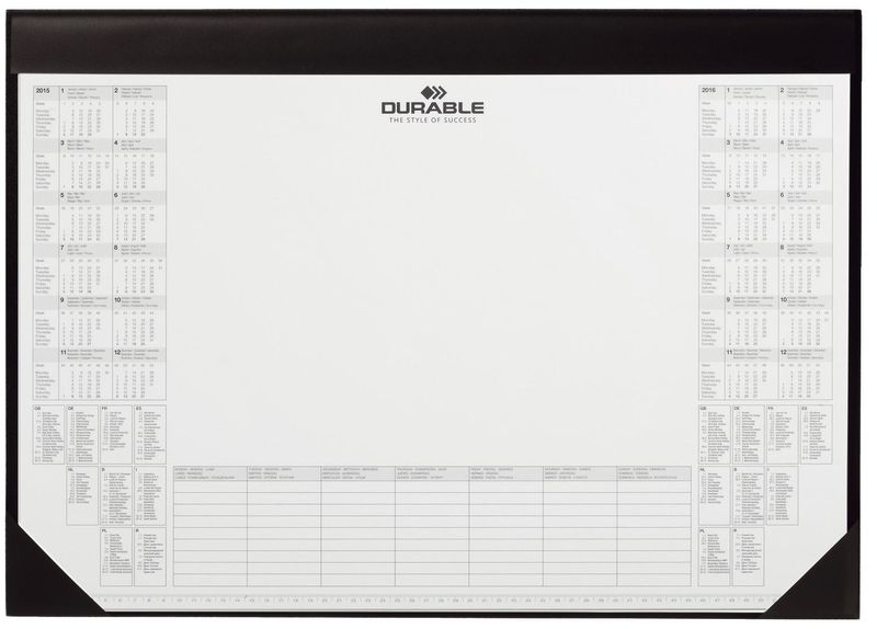 DURABLE Schreibunterlage mit Block Schreibunterlage, Farbe schwarz, Hersteller: Durable, Herstellernummer: 7291-01, EAN: 4005546701134, Schreibunterlage aus PVC mit integriertem Papierblock (25 Blatt). Mit aufgedrucktem 2-Jahres-Kalendarium, internationalen Feiertagen und Wochenplan. Oben verleimt. Format (BxH): 590 x 420 mm., Preis je Stück
