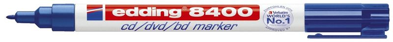 CD-, DVD-, BD-Marker, Schreibfarbe blau, Hersteller: Edding, Herstellernummer: 04 8400 003, EAN: 4004764827176, Spezialmarker mit weicher Rundspitze für die schonende Beschriftung von CD-Rohlingen, CDs, CD-ROMs, DVDs und Blu-ray Discs. Pigmenttusche auf Wasserbasis, ohne Lösungsmittel, somit wird die Datenträgerschicht nicht angegriffen. Kappe und Spitze in Schreibfarbe. e-8400: permanent, nach dem Antrocknen wisch- und wasserfest. e-8500: Beschriftung mit angefeuchtetem Tuch rückstandslos entfernbar. Empfohlen von Verbatim. , Preis je Stück