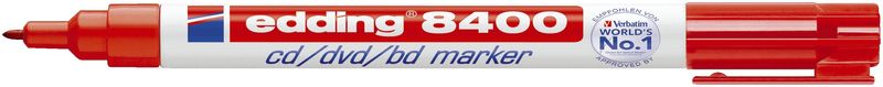 CD-, DVD-, BD-Marker, Schreibfarbe rot, Hersteller: Edding, Herstellernummer: 04 8400 002, EAN: 4004764827145, Spezialmarker mit weicher Rundspitze für die schonende Beschriftung von CD-Rohlingen, CDs, CD-ROMs, DVDs und Blu-ray Discs. Pigmenttusche auf Wasserbasis, ohne Lösungsmittel, somit wird die Datenträgerschicht nicht angegriffen. Kappe und Spitze in Schreibfarbe. e-8400: permanent, nach dem Antrocknen wisch- und wasserfest. e-8500: Beschriftung mit angefeuchtetem Tuch rückstandslos entfernbar. Empfohlen von Verbatim. , Preis je Stück