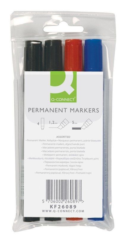 Permanentmarker, Schreibfarbe 4-er Etui: blau, rot, 2 x schwarz, Hersteller: Connect, Herstellernummer: KF26089, EAN: 5706002260897, Marker für alle glatten und rauhen Flächen. Geruchsarme, ungiftige Tusche auf Alkoholbasis, schnell trocknend, wisch- und wasserfest. Kappe mit Clip und Schaft in Schreibfarbe., Preis je Packung