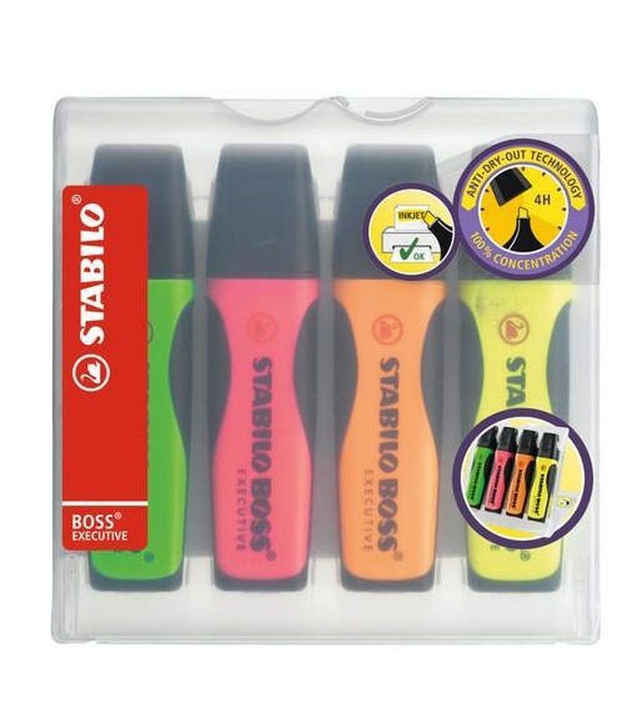 Textmarker, Schreibfarbe Etui mit 4 Farben, Hersteller: Stabilo®, Herstellernummer: 73/4, EAN: 4006381376617, Premium Leuchtmarkierer in klassischer Form und mit bewährten Produkteigenschaften, verbessert durch eine weiche, ergonomische Griffzone für mehr Komfort beim Leuchtmarkieren. Patentierte Anti Schmier Tinte mit speziellen Pigmenten. Tinte auf Wasserbasis für Paper Copy Fax. Hohe Offenlagerfähigkeit. Strichstärke 2 - 5 mm. Schaft in Leuchtfarben. , Preis je Packung