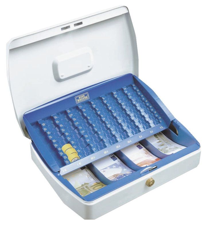 Geldkassette, Geldkoffer, Farbe weiß/blau, Hersteller: Burg-Wächter, Herstellernummer: ZK 2307 EURO, EAN: 4003482287408, Komplett mit herausnehmbarem Euro-Einsatz für Banknoten und Münzen. Aufgrund der flachen Bauweise passt die Kassette hervorragend in Schubladen. Münzeinsatz kann in den geöffneten Deckel hochgestellt werden. Der Einsatz ist herausnehmbar. Aus Stahlblech., Preis je Stück