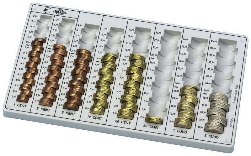 Geldzählbrett, Scheinfach, Farbe lichtgrau, Hersteller: Wedo®, Herstellernummer: 160 100837, EAN: 4003801727783, Hartgeldeinsatz mit 8 Münzräumen in 8 Reihen aus Polystyrol. Wischfeste Wertskala. 4 rutschfeste Gummifüße. Fassungsvermögen Hartgeld: 246,40 Euro. Größe (B x T x H): 328 x 178 x 31 mm., Preis je Stück