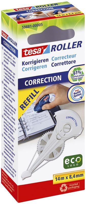 Kassette für Korrekturroller, Korrekturband 8,4 mm x 14 m, Hersteller: Tesa®, Herstellernummer: 59881-00005-05, EAN: 4042448110510, Nachfüllbarer Korrekturroller für präzise Korrekturen von gedrucktem und handgeschriebenem Text. Trockenes Korrigieren zum sofortigen Überschreiben. Deckt und haftet gut. Reißfestes Band (Polyester), lösungsmittelfrei. Weißes Korrekturband. Erhältlich in 2 Bandbreiten: 4,2 mm für gedruckten Text, 8,4 mm für handgeschriebenen Text. Nachfüllroller aus 81% recyceltem Plastik (ohne Tape). Nachfüllkassetten aus 61% recyceltem Plastik (ohne Tape). Verpackung aus 80% receyceltem Karton., Preis je Stück