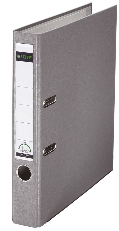 Plastik-Ordner 180° Rückenbreite 52 mm, Farbe grau, Hersteller: Leitz, Herstellernummer: 1015-50-85, EAN: 4002432359639, Für höchste Beanspruchung Tag für Tag. Schmutz- und feuchtigkeitsabweisend. Einband aus Pappe (RC), außen mit Polypropylen kaschiert, innen hellgraues PE-beschichtetes Papier. Sichttasche (PP) am Rücken mit auswechselbarem Rückenschild. Ordner mit 180°-Pr, Preis je Stück