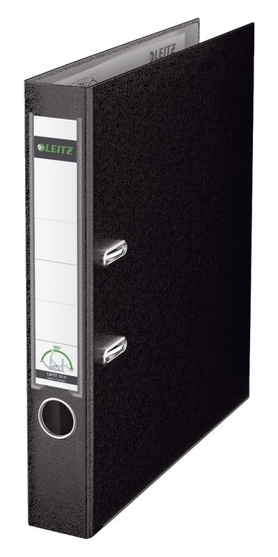 Plastik-Ordner 180° Rückenbreite 52 mm, Farbe schwarz, Hersteller: Leitz, Herstellernummer: 1015-50-95, EAN: 4002432359646, Für höchste Beanspruchung Tag für Tag. Schmutz- und feuchtigkeitsabweisend. Einband aus Pappe (RC), außen mit Polypropylen kaschiert, innen hellgraues PE-beschichtetes Papier. Sichttasche (PP) am Rücken mit auswechselbarem Rückenschild. Ordner mit 180°-Pr, Preis je Stück