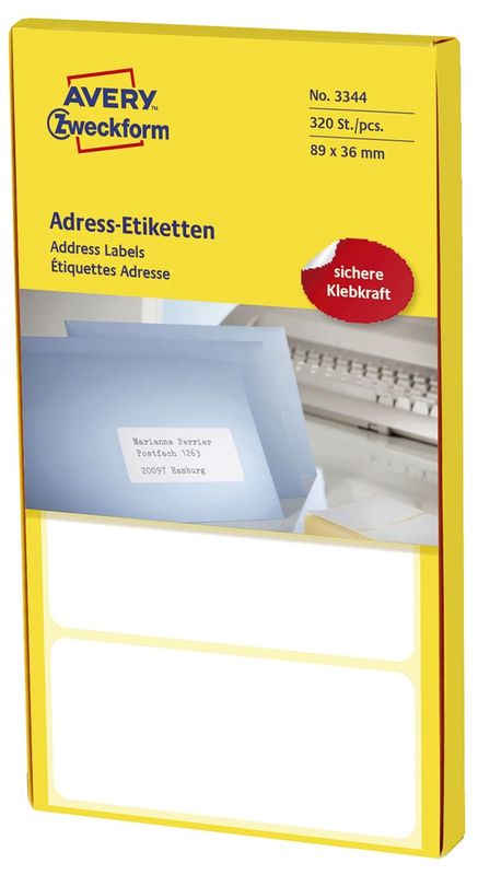 Adress-Etikett, Absender-Etikett, Größe (B x H) 89x36 mm, Inhalt 320 Stück, Hersteller: Avery Zweckform®: Herstellernummer: 3344, EAN: 4004182033449, , Preis je Packung