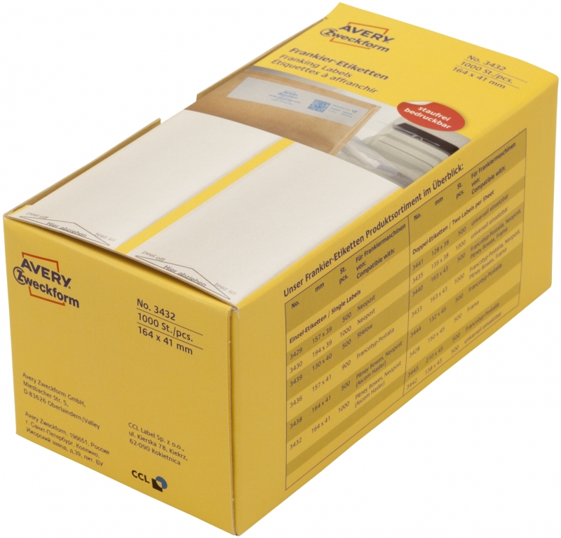 Frankier-Etikett, Größe (B x H) 168x44 mm, Inhalt 1000 Stück, Hersteller: Avery Zweckform®: Herstellernummer: 3432 *, EAN: 4004182034323, * Für Wechselklischees, z. B. Päckchen geeignet., Preis je Packung